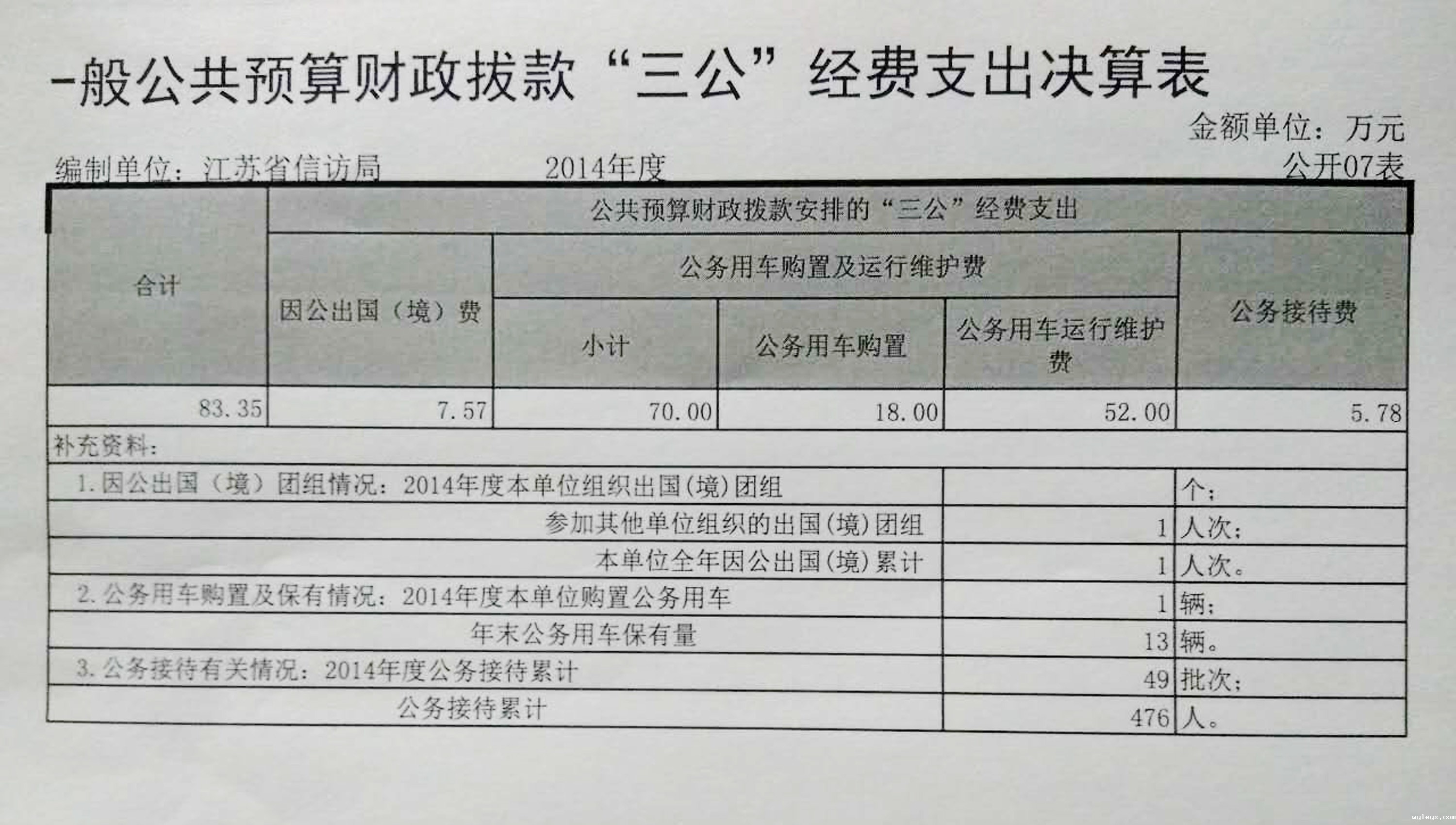 2014年“三公经费”公共预算财政拨款支出决算 83.35 万元,其中:因公出国(境)费支出 7.57万元,占9.08 %;公务用车购置及运行费支出70万元,占83.98 %;公务接待费支出5.78万元,占6.94 %。