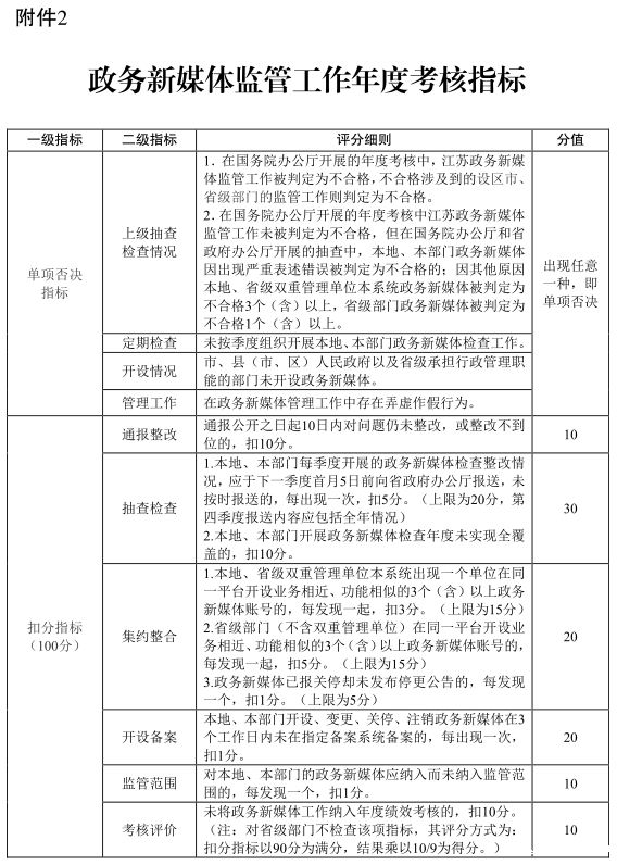 (十四)严格监管考核。各地各部门要加强对政务新媒体的常态化监管,按季度组织检查,及时通报存在的突出问题,督促落实整改。设区市、省有关部门检查和整改落实情况要向省政府办公厅做出报告。有条件的政务新媒体要开设纠错入口,方便网民参与检查监督。要将政务新媒体工作列为政务公开年度绩效考核评价指标,结合政务新媒体发展实际和工作重点,制定可获取、可量化、可考核的科学指标体系,并实施动态调整。省政府办公厅每季度对全省政务新媒体运行情况进行抽查,每年度对政务新媒体建设、监管等工作进行考核,抽查和考核结果将予以公开通报。对成效好的单位和个人,按照有关规定予以激励表扬;对违反规定发布转载不良或有害信息、破坏网络传播秩序、损害公众权益等突出问题,要严肃追责问责。