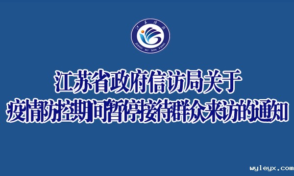 为进一步落实国家及江苏省对新型冠状病毒感染的肺炎疫情防控工作决策部署,最大限度减少人员流动聚集,保护人民群众生命安全和身体健康,按照国家信访局关于暂停接待群众来访的通知精神和江苏省公共卫生事件一级响应机制,即日起,江苏省人民来访接待中心、省各有关部门和单位接访场所暂停接访,恢复接待时间视疫情形势变化另行通知。各地可结合本地疫情防控需要,决定是否暂停接访并向社会公布。