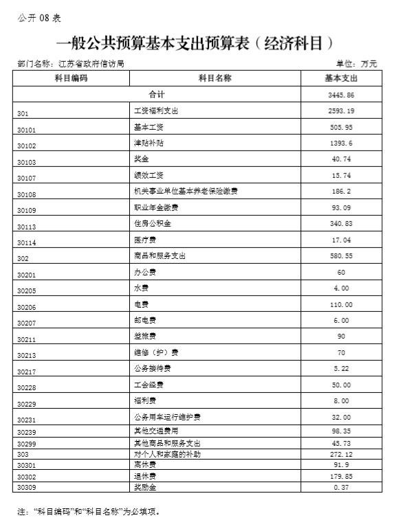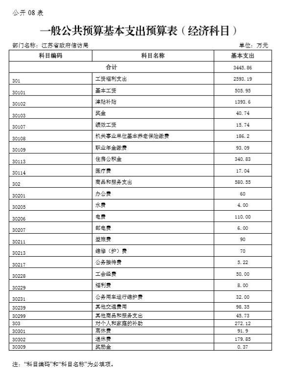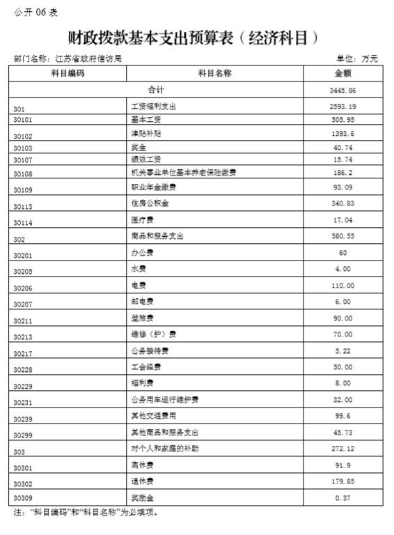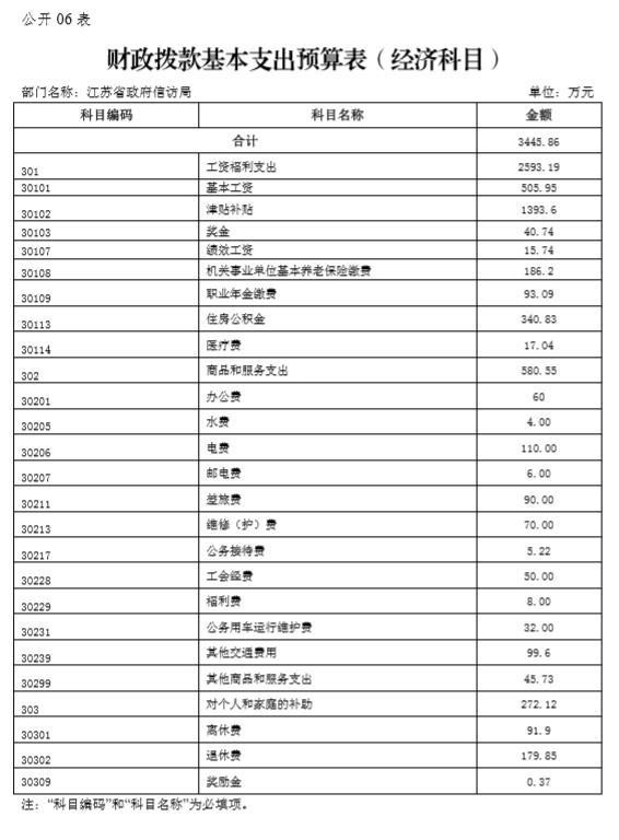 江苏省政府信访局2020年度一般公共预算财政拨款基本支出预算3445.86万元,其中: