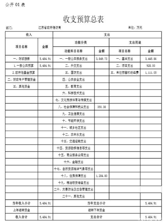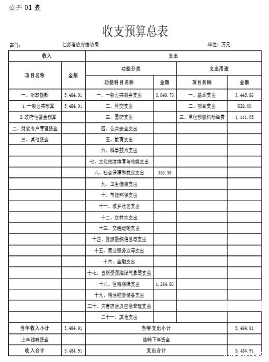 江苏省政府信访局2020年度收入、支出预算总计5484.91万元,与上年相比收、支预算总计各增加419.62万元,增长8.28%。其中: