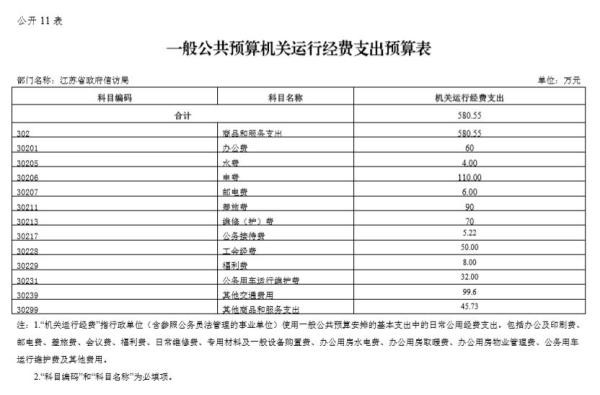 (二)公用经费580.55万元。主要包括:办公费、水费、电费、邮电费、维修(护)费、公务接待费、工会经费、福利费、公务用车运行维护费、其他交通费用、其他商品和服务支出。
