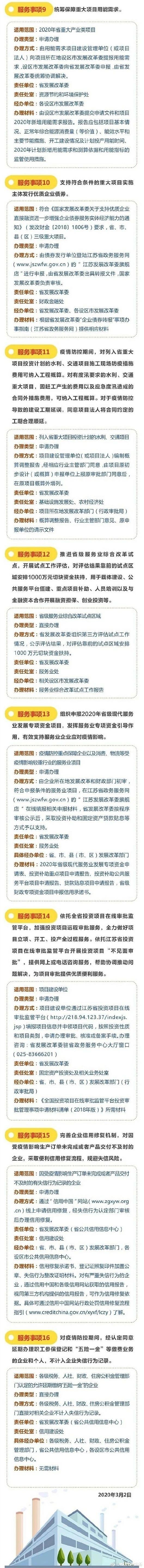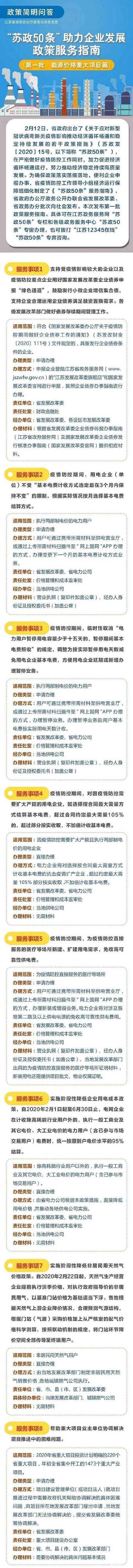 2月12日,省政府出台了《关于应对新型冠状病毒肺炎疫情影响推动经济循环畅通和稳定持续发展的若干政策措施》(简称“苏政50条”),为确保政策落实落细落地,省疫情防控工作领导小组经济运行保障组细化制定了《“苏政50条”政策服务指南》,对企业申办具体服务事项作出指引。省政府办公厅政务公开办联合省发展改革委、省政务办分批次向社会发布。本次发布第一批16项服务事项,涉及能源价格、重大项目、投资审批、产业支持、金融服务、信用建设等,希望能帮助企业。