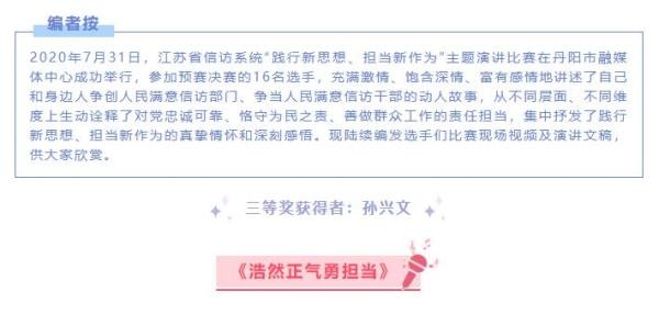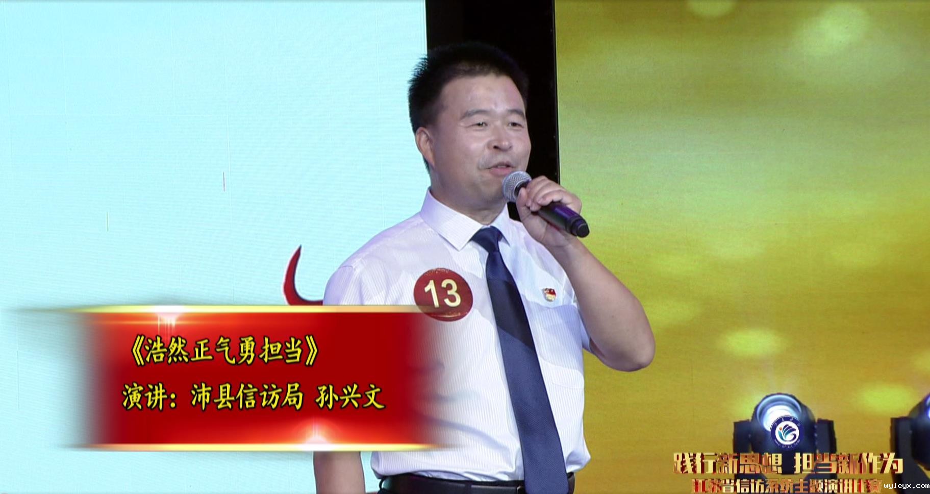 上午好!我是徐州沛县信访局的孙兴文,今天我演讲的题目是《浩然正气勇担当》。