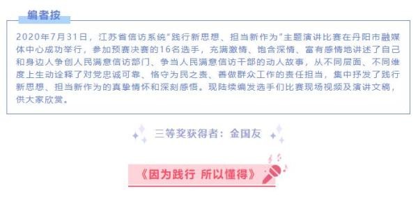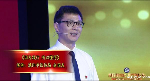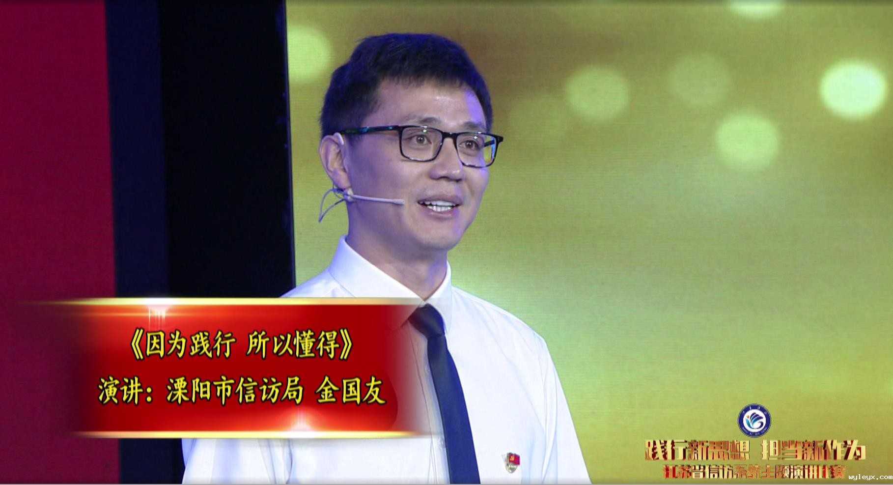 大家上午好!我是3号选手,我叫金国友,来自溧阳市信访局,今天我演讲的题目是因为践行,所以懂得。