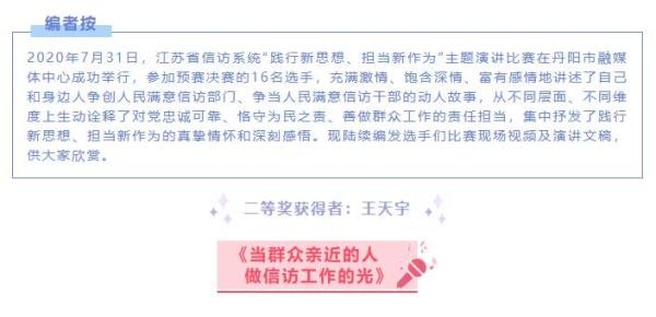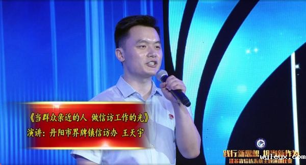 我是来自镇江丹阳的王天宇,今天我要为大家演讲的题目是《当群众亲近的人,做信访工作的光》。