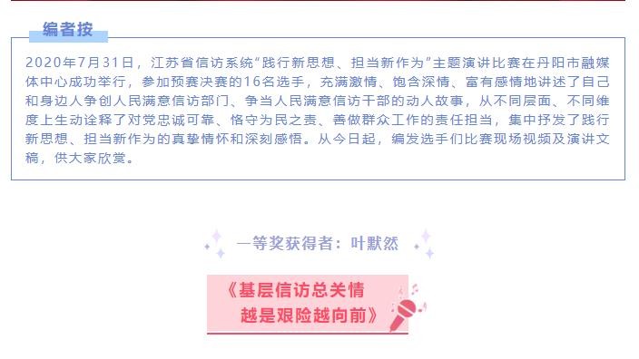 我是7号选手叶默然,来自南京浦口永宁街道。我演讲的题目是:基层信访总关情,越是艰险越向前。