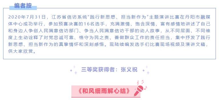 大家好,我是来自连云港市水利局的信访工作人员张义祝,我演讲的题目是《和风细雨解心结》。