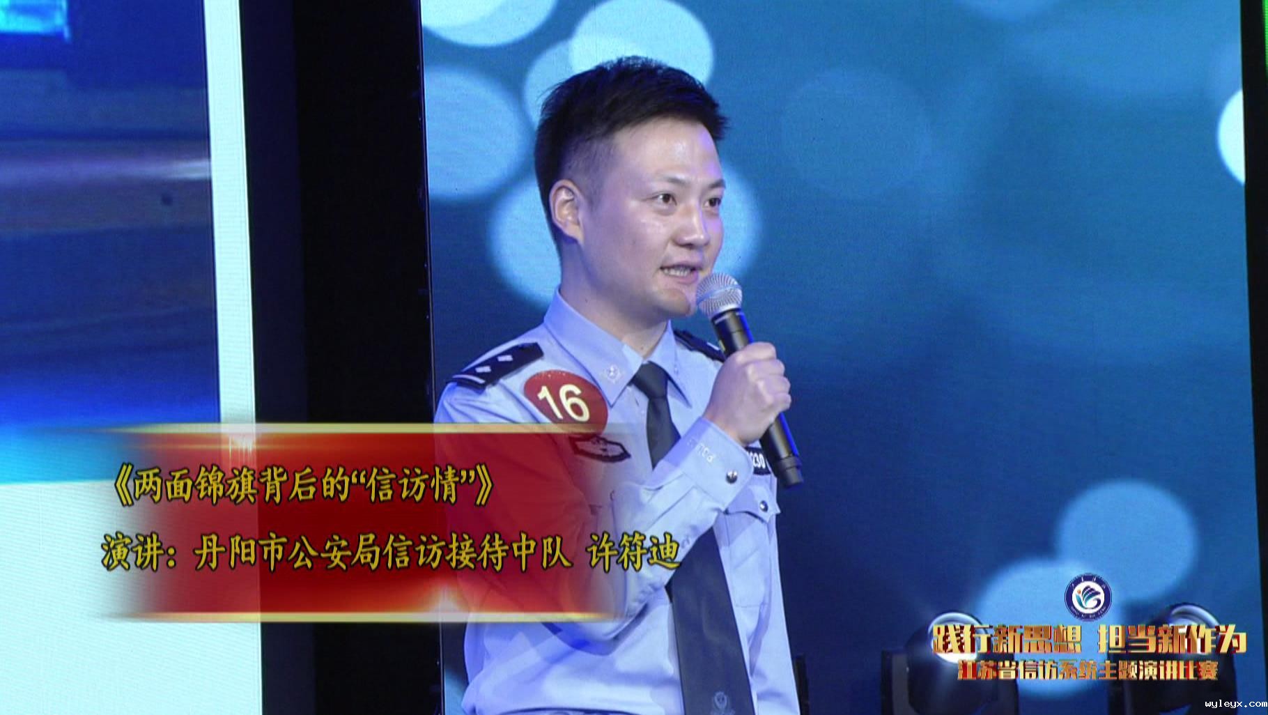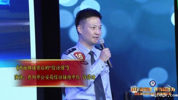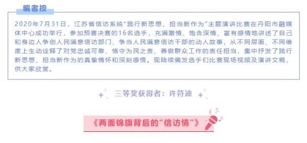 大家上午好!我是来自镇江丹阳的许符迪。很荣幸,能由我在整场比赛的尾声向大家讲述公安信访故事。今天,我演讲的题目是《两面锦旗背后的“信访情”》