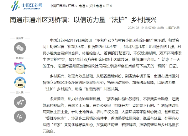 乡村振兴,治理有效是基础。从稻香里解纠纷,到麦浪中调矛盾,南通市通州区刘桥镇立足辖区涉农矛盾纠纷发展新形势,拓宽信访服务、加强法治赋能,以信访力量“法护”乡村振兴,助推“和谐刘桥”共富共美。