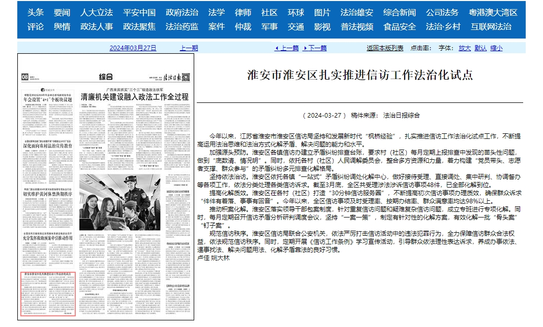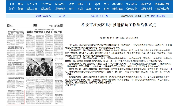 今年以来,江苏省淮安市淮安区信访局坚持和发展新时代“枫桥经验”,扎实推进信访工作法治化试点工作,不断提高运用法治思维和法治方式化解矛盾、解决问题的能力和水平。