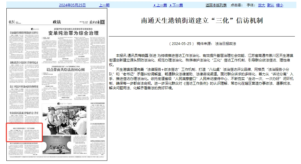本报讯 通讯员梅晓磊 张进 为持续推进信访工作法治化,有效提升基层治理社会效能,江苏省南通市崇川区天生港镇街道创新建立源头预防法治化、规范办理法治化、秩序维护法治化“三化”信访工作机制,引导群众依法信访、理性维权。