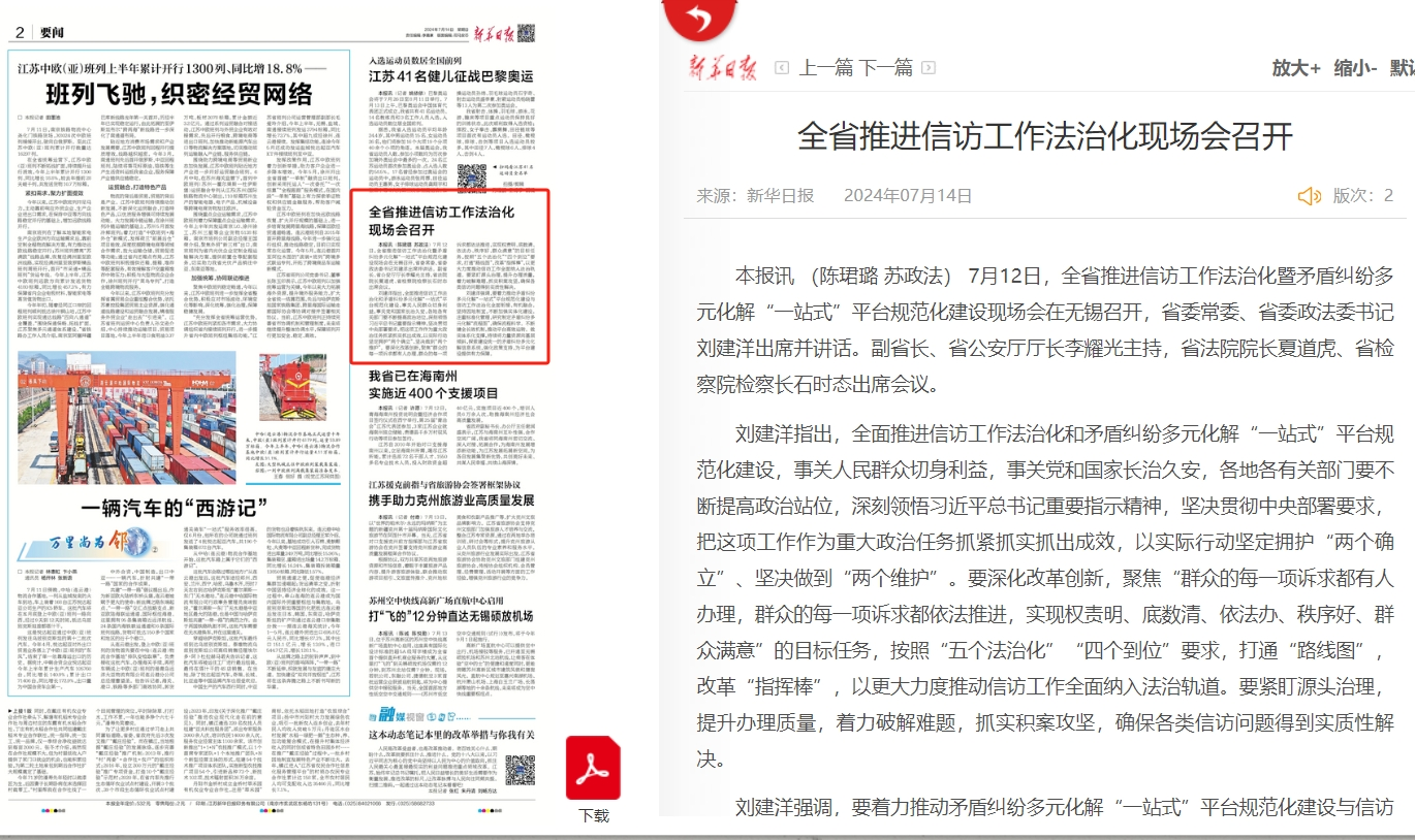 本报讯 (陈珺璐 苏政法) 7月12日,全省推进信访工作法治化暨矛盾纠纷多元化解“一站式”平台规范化建设现场会在无锡召开,省委常委、省委政法委书记刘建洋出席并讲话。副省长、省公安厅厅长李耀光主持,省法院院长夏道虎、省检察院检察长石时态出席会议。