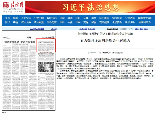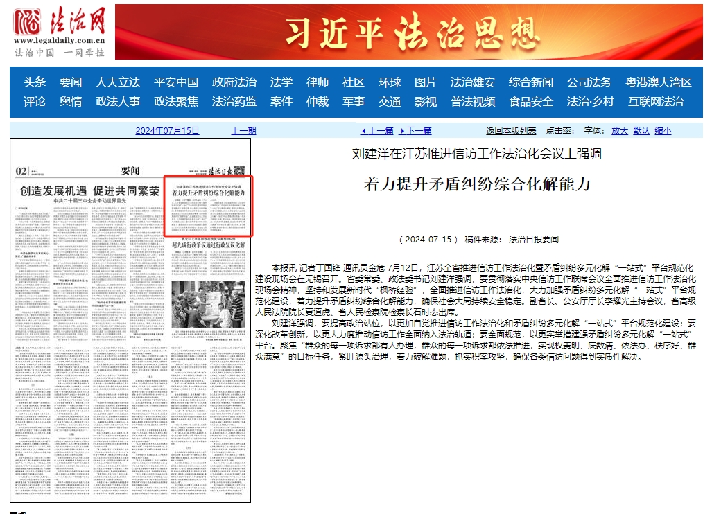 本报讯 记者丁国锋 通讯员金危 7月12日,江苏全省推进信访工作法治化暨矛盾纠纷多元化解“一站式”平台规范化建设现场会在无锡召开。